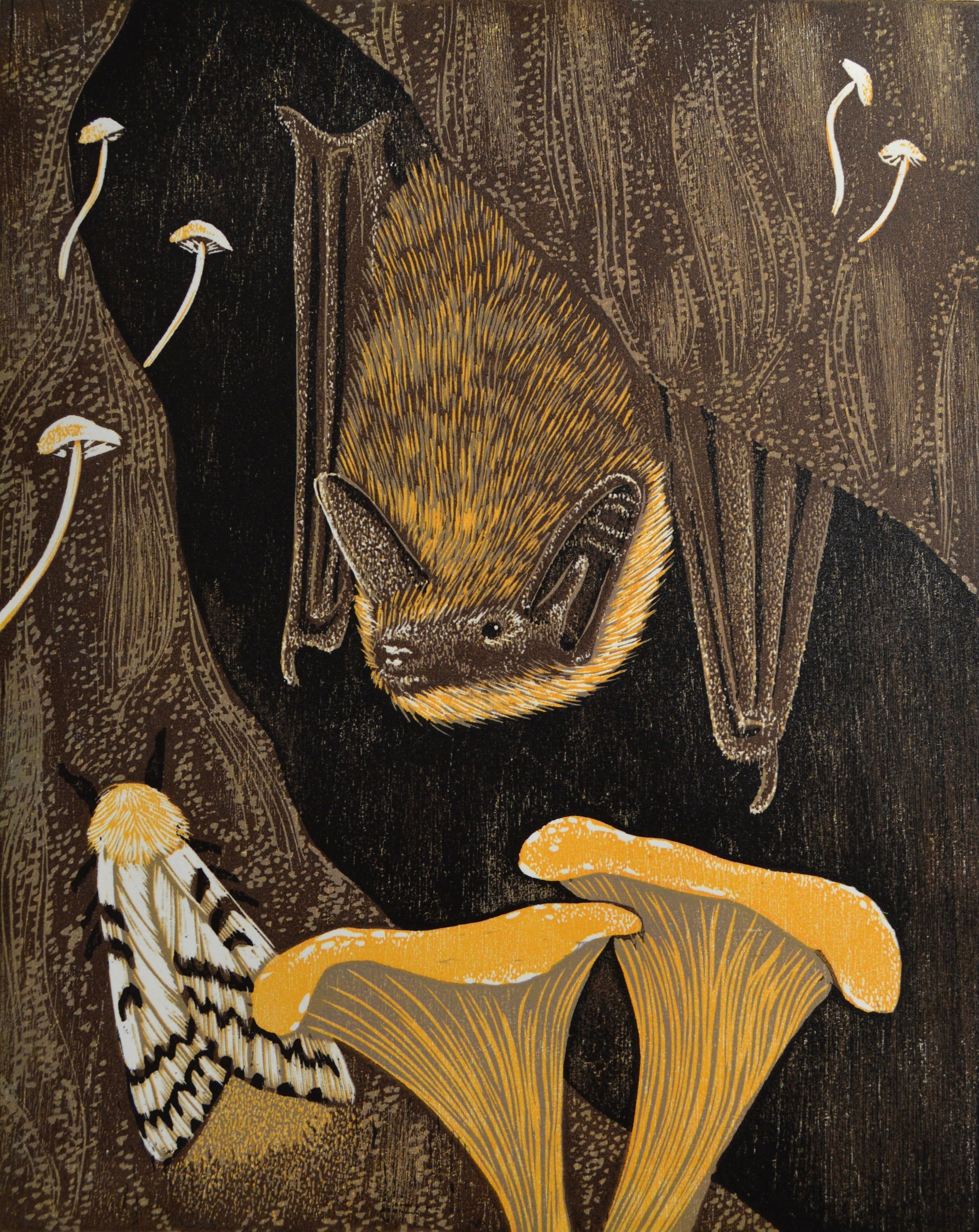 Visually, my prints lean into texture, using wire brushes, stippling, and small repetitive marks. I approach carving intuitively as opposed to planning each mark precisely, so that the process feels more exploratory and natural. While my large-scale works are printed with black ink and feature a greater variety of organisms, my smaller scale works are multi-color reduction prints that center one particular species.